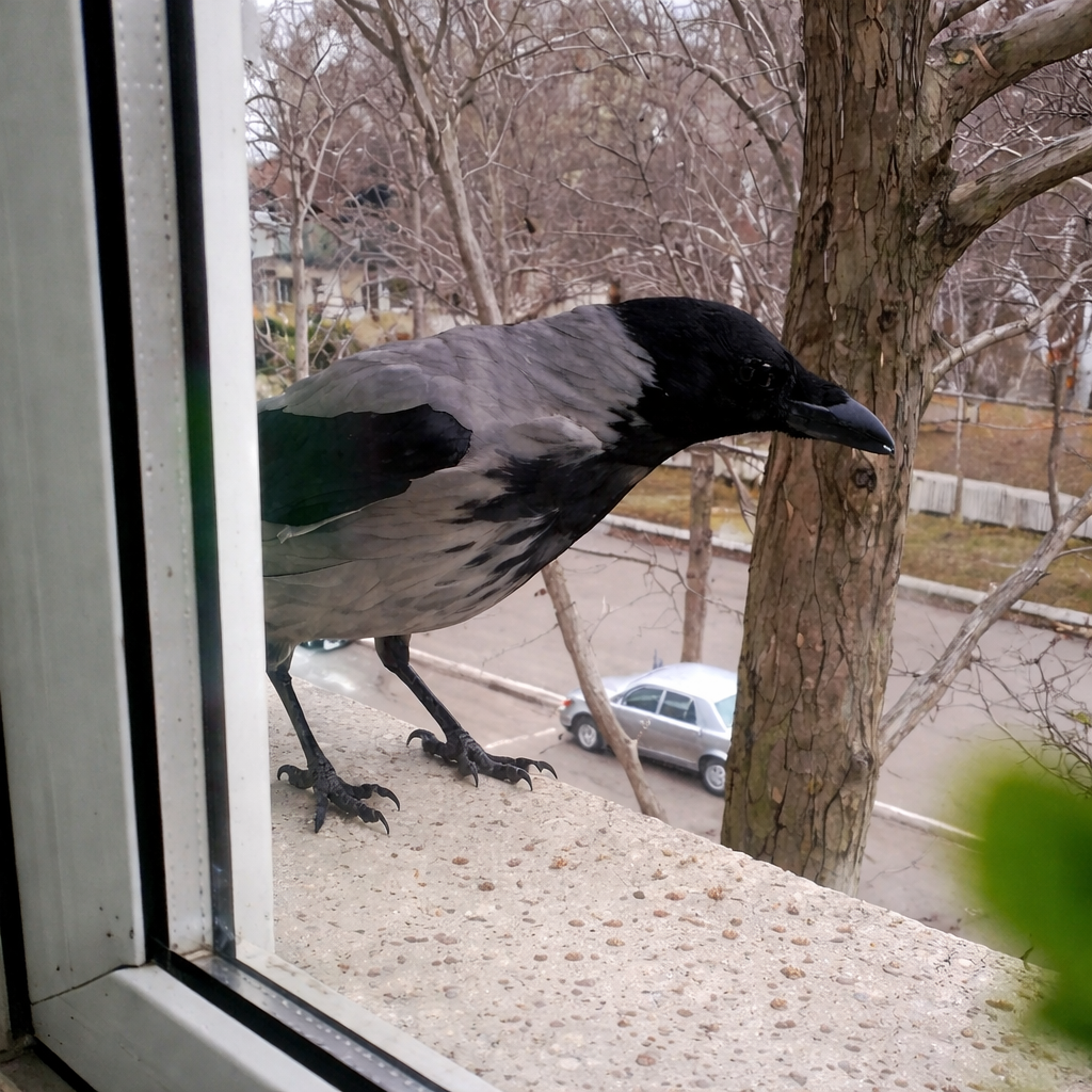 Утром всё повторилось: кормление, возмущённое карканье, упрямство с обеих сторон. И вдруг он заметил, что снаружи на подоконнике сидит крупный ворон — самец — и внимательно наблюдает за происходящим.